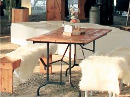 Tafel 180x80cm en 1 bank, 3 krukjes excl. vachten €20,00
